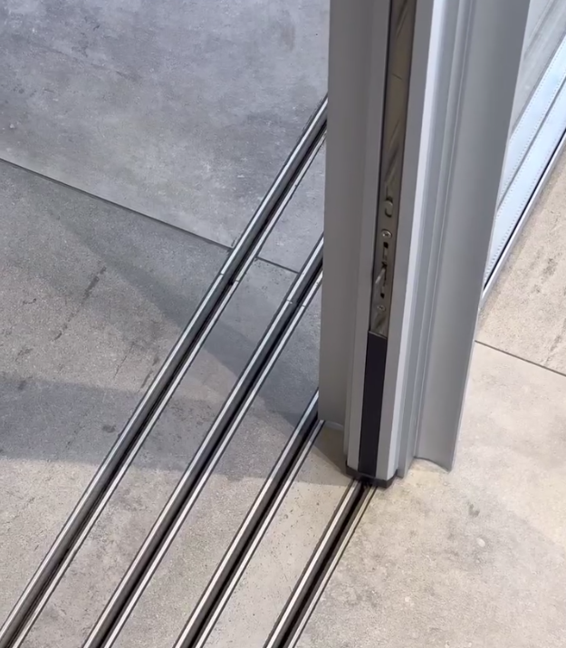 Minimal frame sliding door with an invisible sill. This minimal frame sliding glass door, with its flush and sleek hidden tracks, allow flooring to flow from interior to exterior living space. The seamless transition from inside to out can now be achieved in South Florida.
